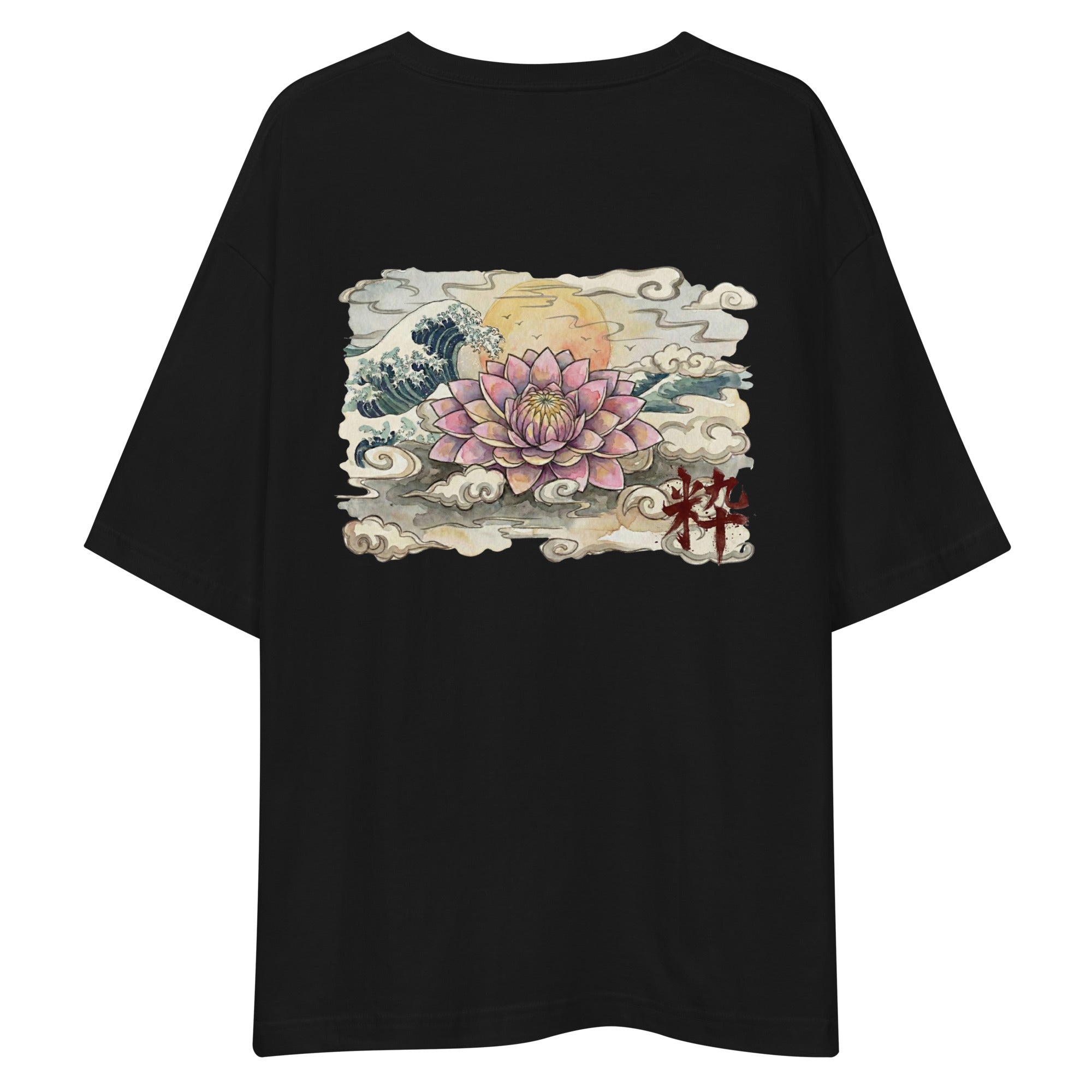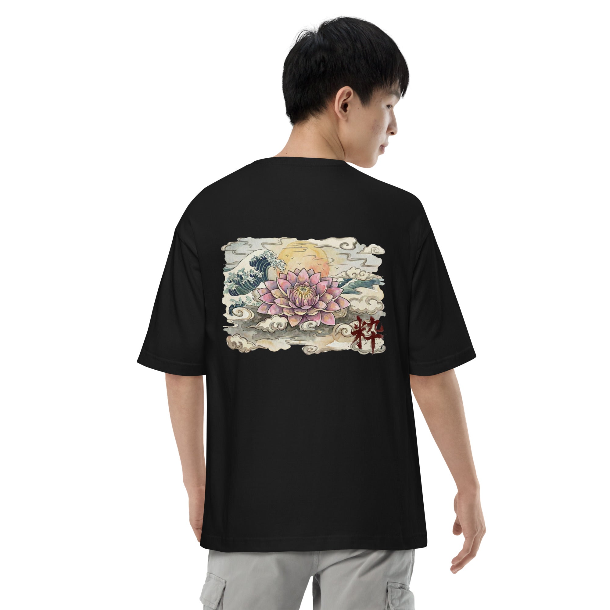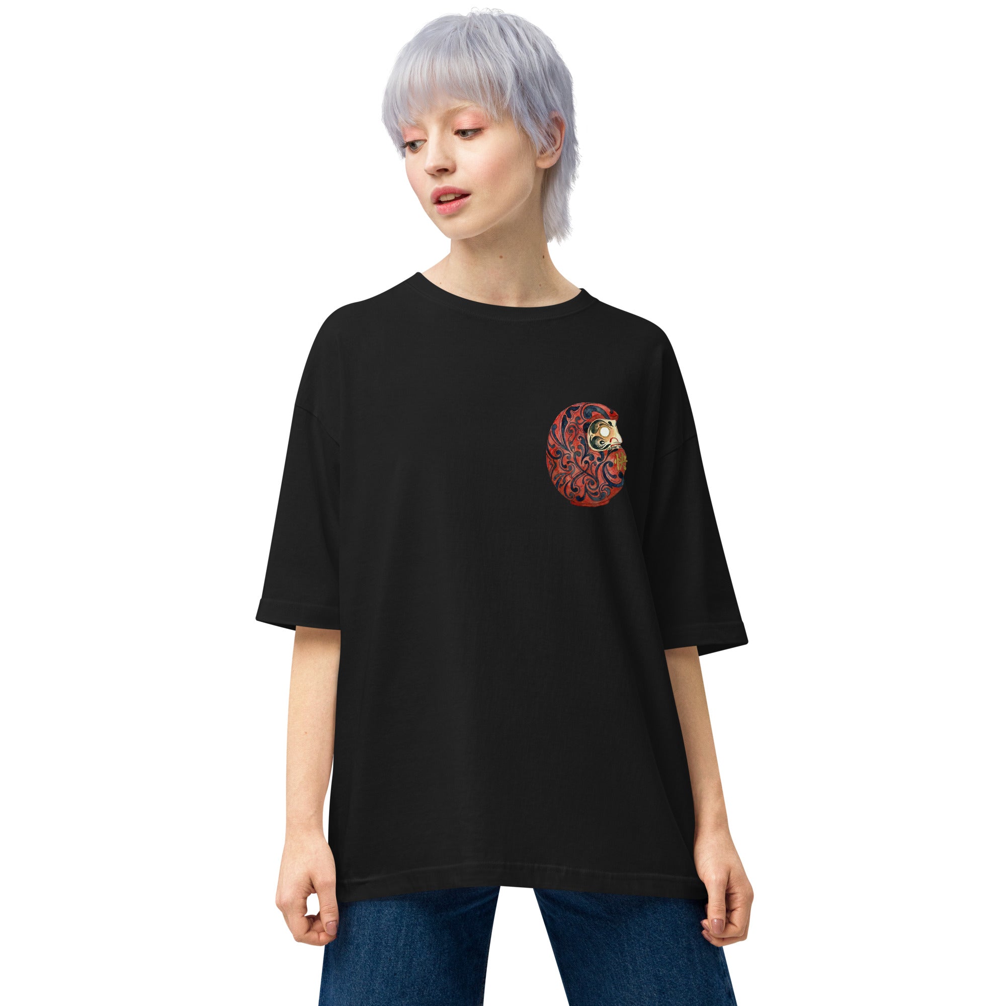 日本の伝統的なアイコンを、現代的なオーバーサイズシルエットに落とし込んだアーティスティックな一着です。フロントには精巧な文様が施された「だるま」を配置し、バックには静寂の中に躍動感を感じさせる「蓮・波・月」の壮大なグラフィックをデザインしました。