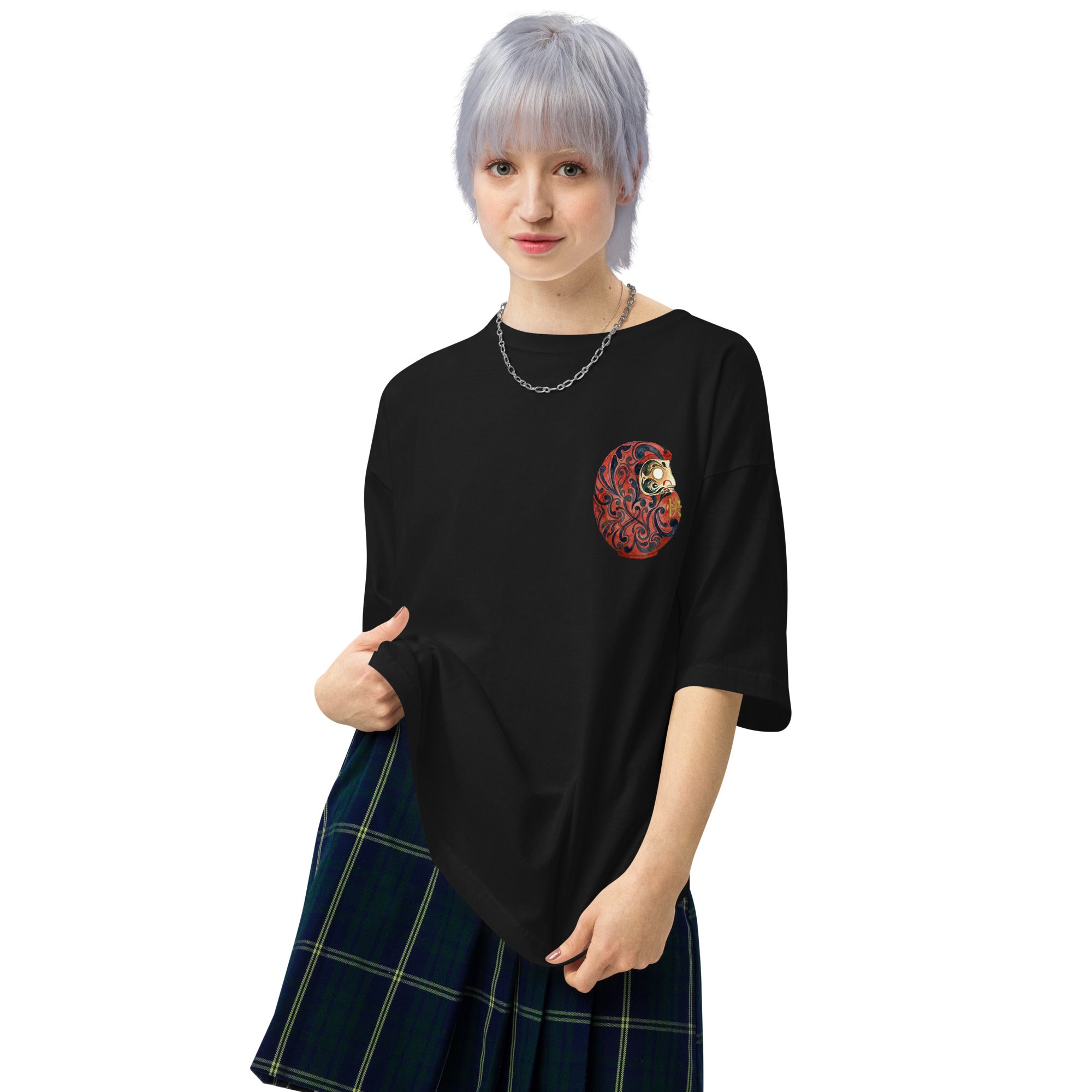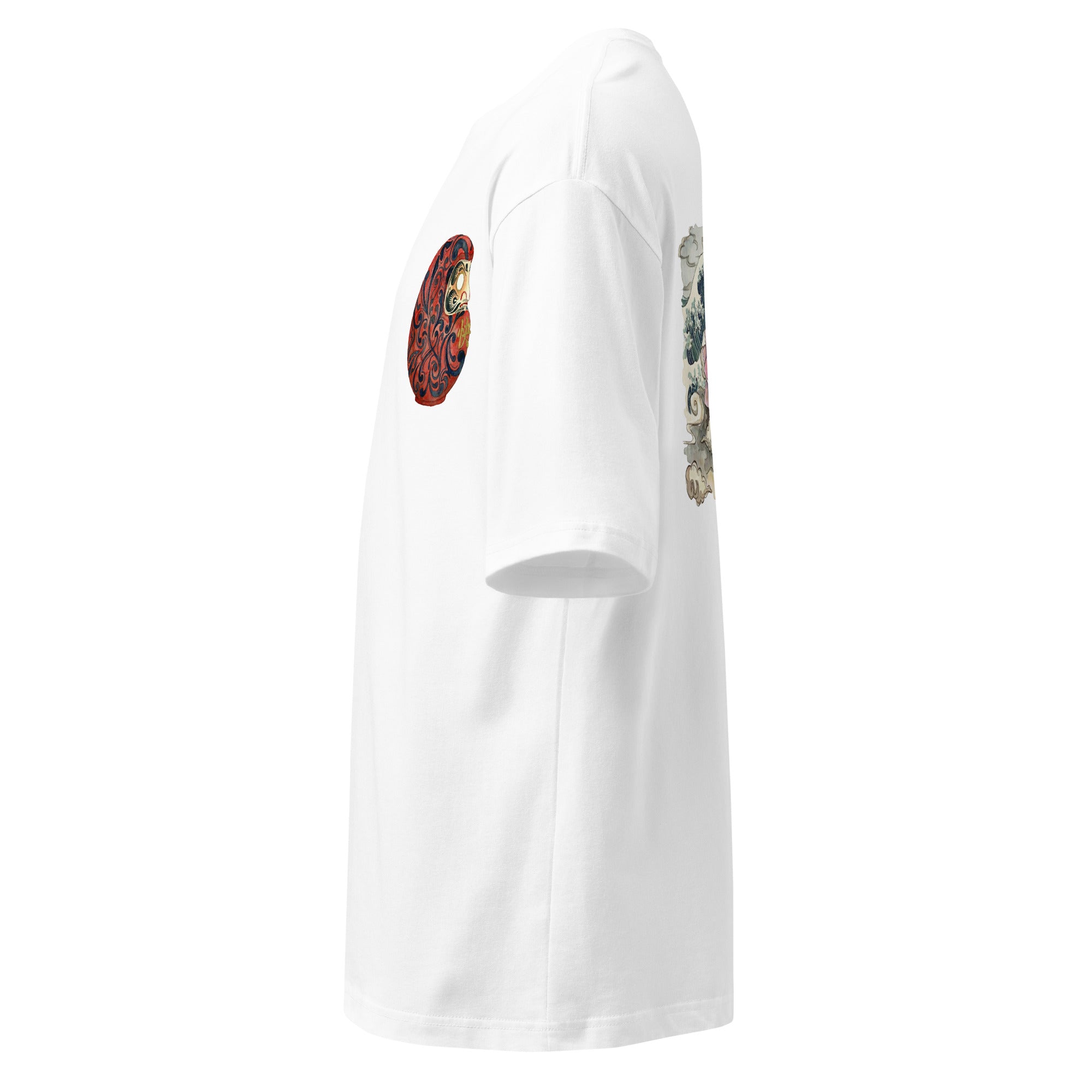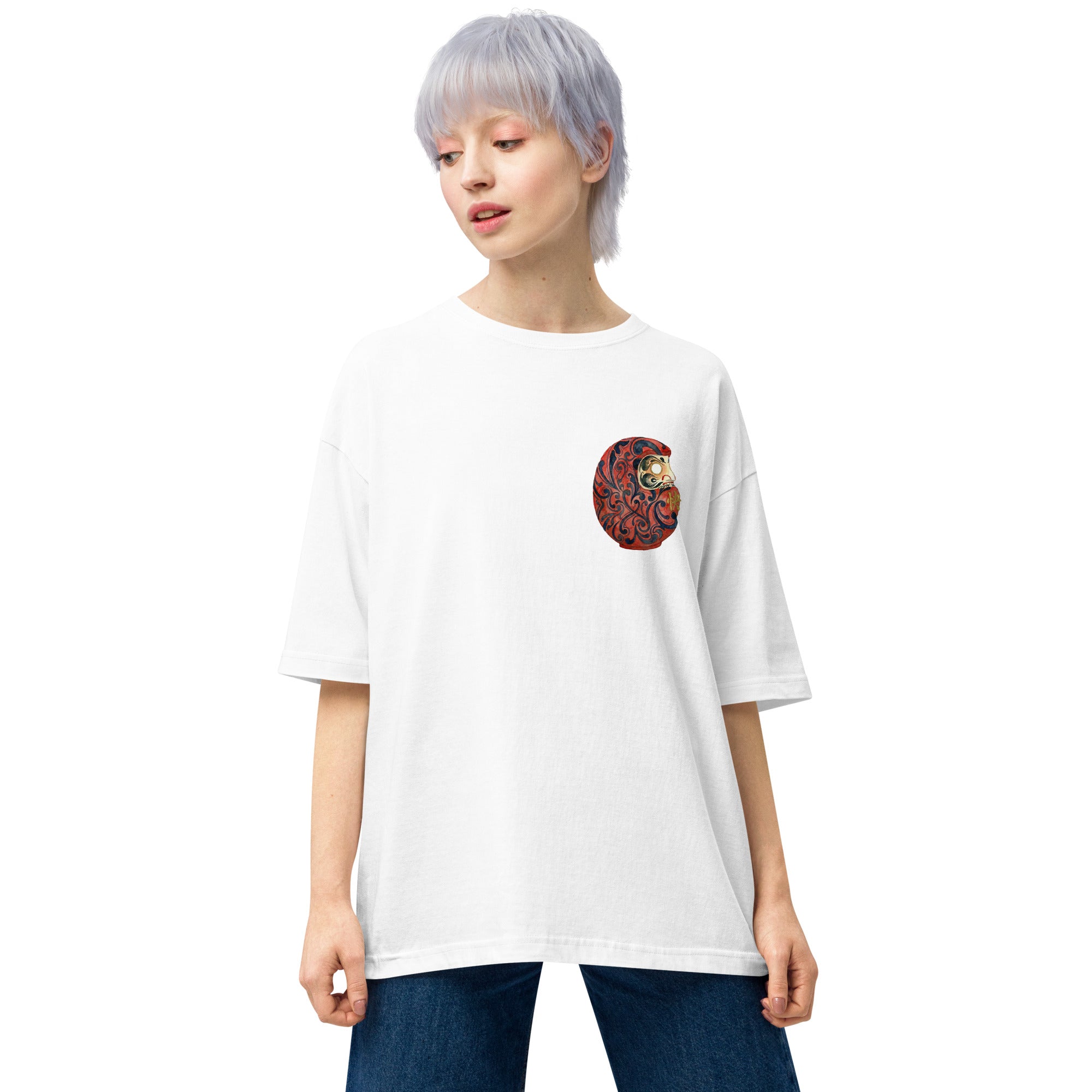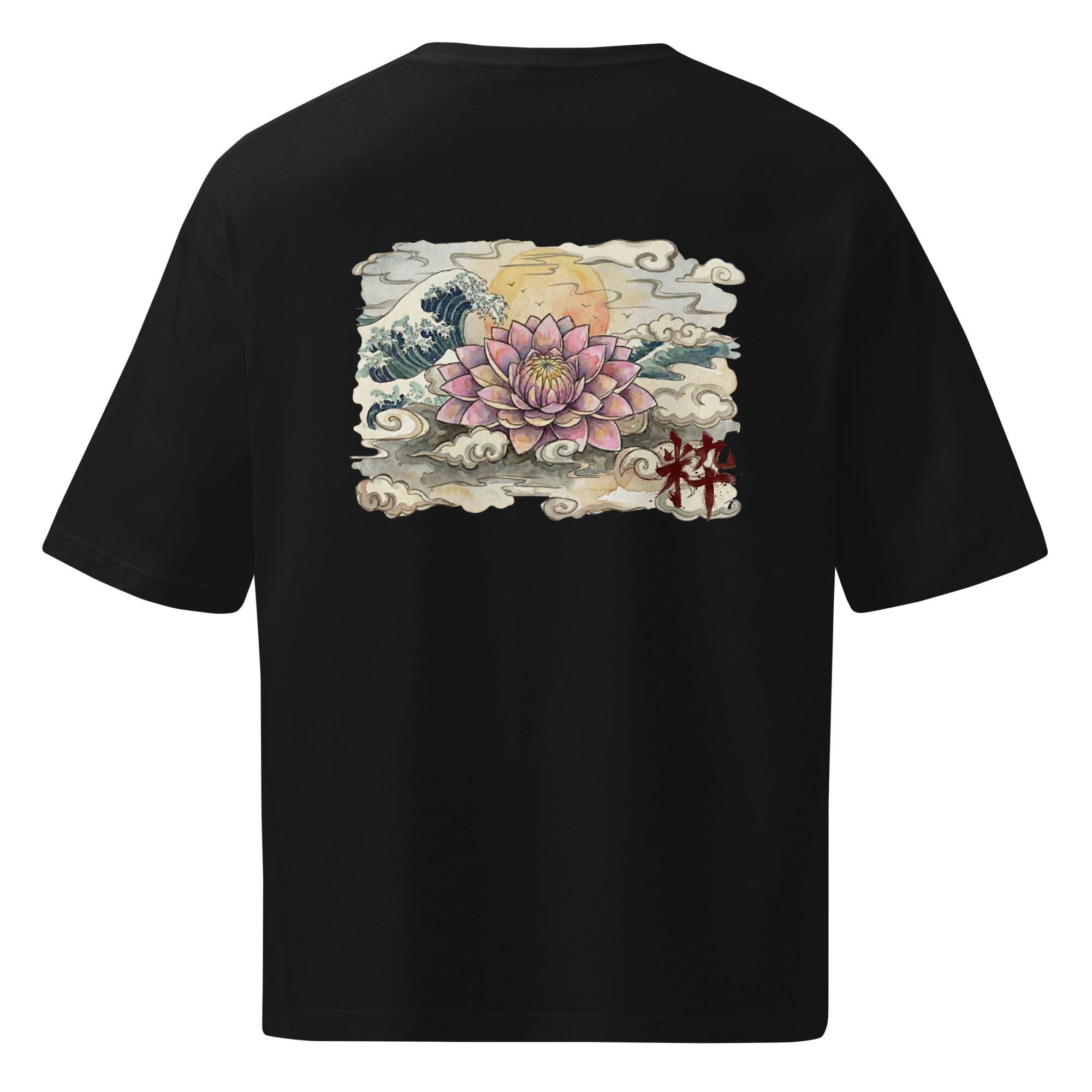 日本の伝統的なアイコンを、現代的なオーバーサイズシルエットに落とし込んだアーティスティックな一着です。フロントには精巧な文様が施された「だるま」を配置し、バックには静寂の中に躍動感を感じさせる「蓮・波・月」の壮大なグラフィックをデザインしました。